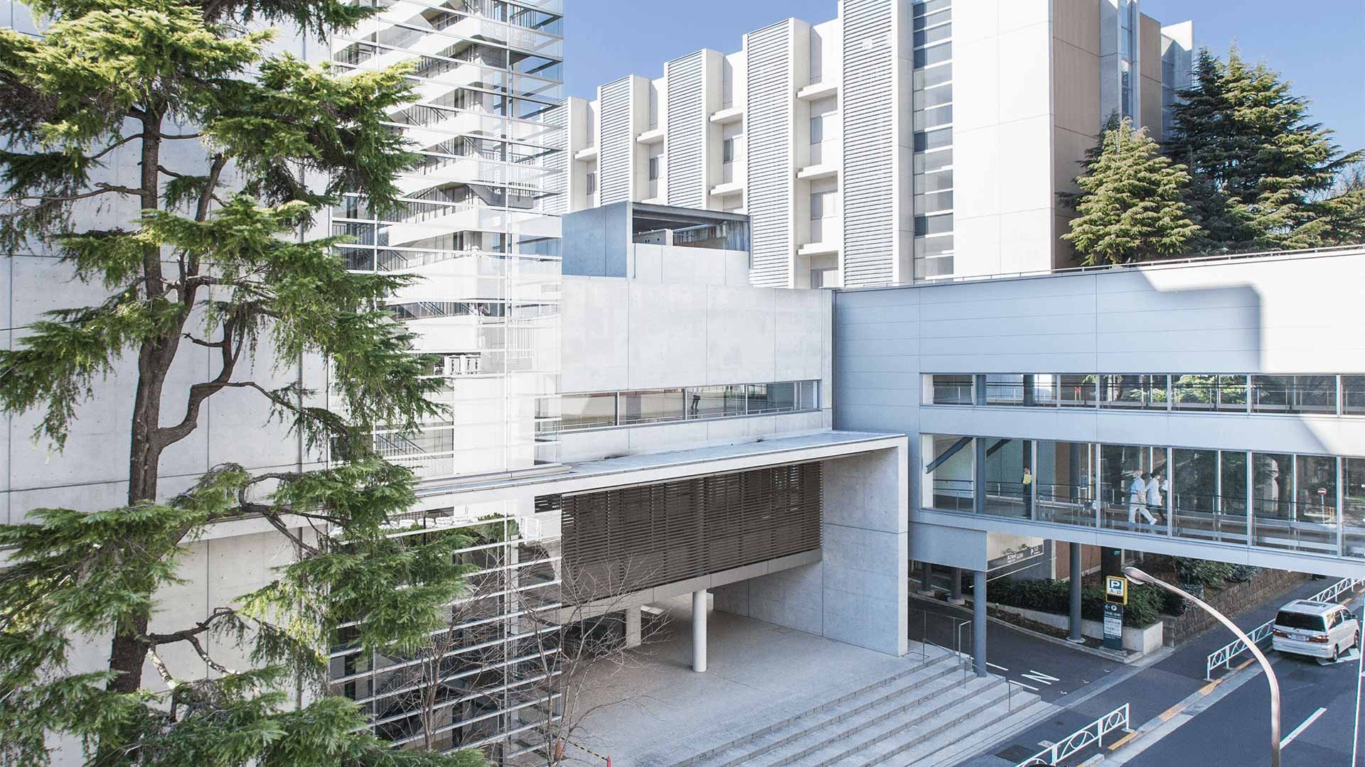The hospital's main entrance (Central Building and Building No. 2). The Central Building (foreground) was completed in 1963. The new hospital building (current Building No. 2, background) was completed in 1986 as part of the 125th anniversary of Keio Gijuku's founding. This new building, 11 stories above ground and 2 below, symbolized the anniversary with its advanced medical information system. It remains a core facility of the hospital today.