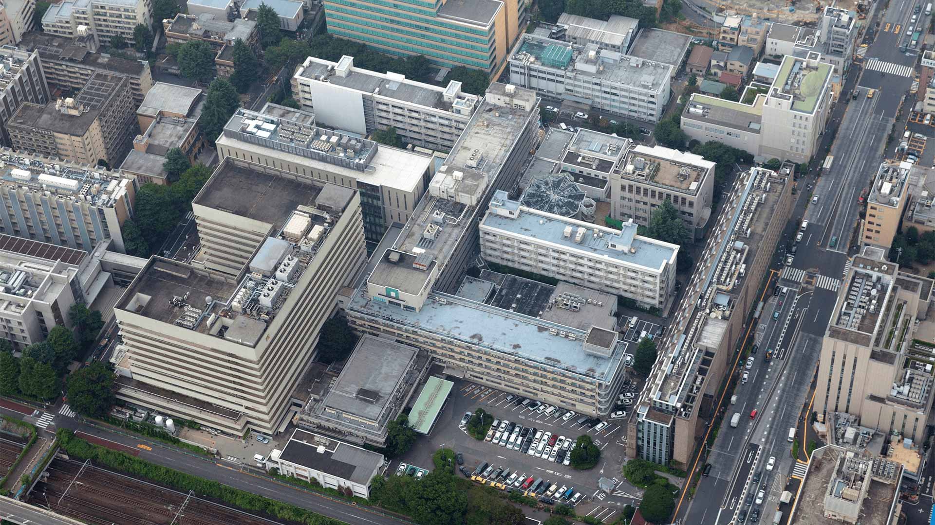 Aerial view of the Shinanomachi Campus upon the completion of University Hospital Building 1.