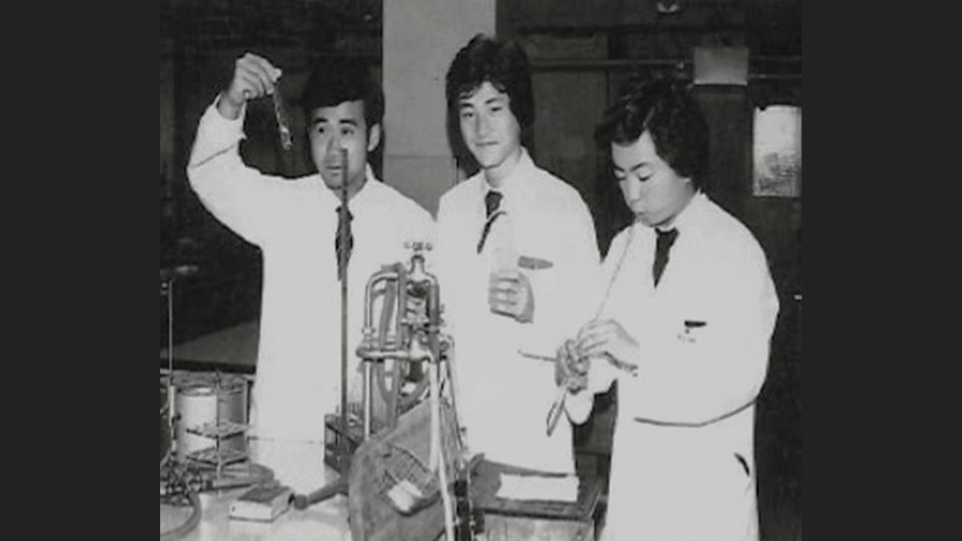 A shot from the School of Medicine graduation album. A commemorative photo of a clinical training scene at the East School Building, taken by members of the clinical training group in their fifth year. (62nd graduating class of School of Medicine. Left: Michito Hirakata; Center: Seiichi Hirobe; Right: Keiichi Fukuda)