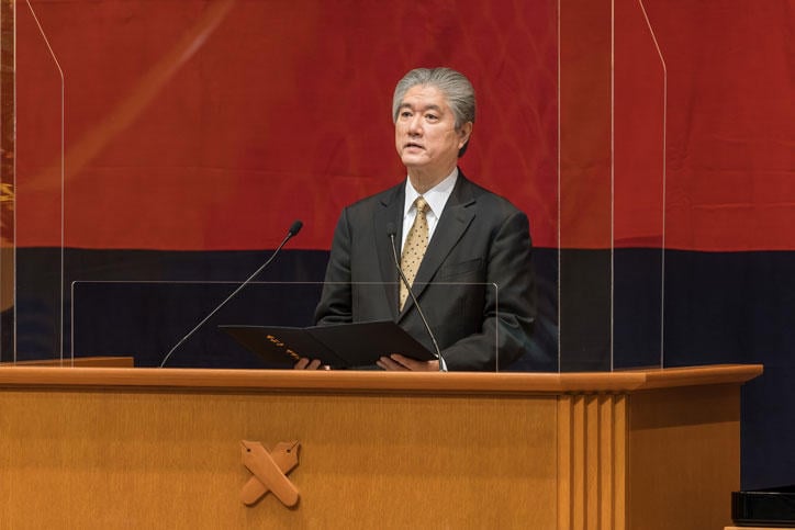 At the 186th Yukichi Fukuzawa Birthday Commemoration Ceremony held on Sunday, January 10, the awards for the 45th Shinzo Koizumi Prize All-Japan High School Essay Contest were presented. This year, President Akira Haseyama presented the awards to the winners via an online broadcast, after which Hiroshi Hayakawa, President and CEO of Hayakawa Publishing Corporation, delivered his comments on behalf of the judges.