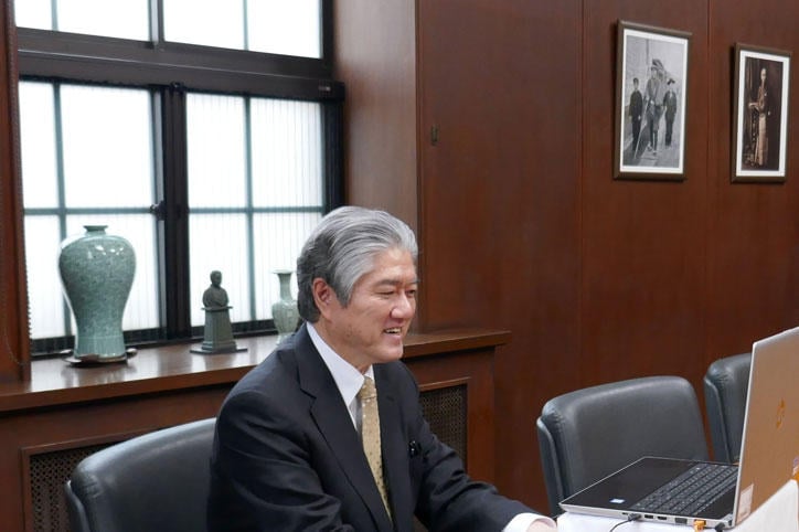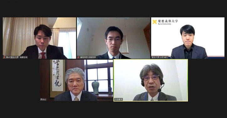 On Friday, February 26, Kenta Yamada (a second-year student at the Faculty of Policy Management), who has served as the new student representative for the All Keio Student Council since February; Noriaki Iwadate (a third-year student at the Faculty of Economics), the Secretary-General; and Keisuke Goto (a third-year student at the Faculty of Economics), the former student representative, met online with President Akira Haseyama.