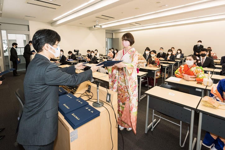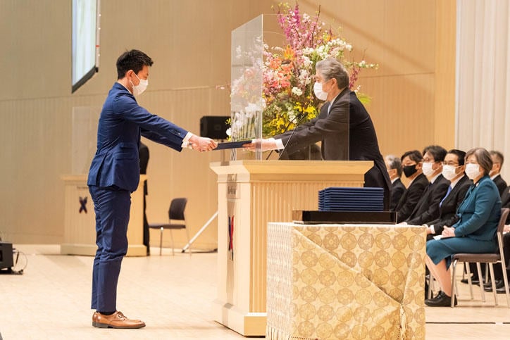From the perspective of giving maximum consideration to the health and safety of the graduating students and degree recipients as well as to the prevention of the spread of COVID-19 (coronavirus disease), participation at the ceremony was limited to the graduating students, degree recipients, and certain related parties, and a video of the event was streamed online for all others interested in following the proceedings.