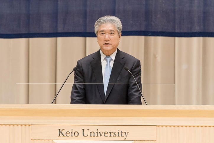 The ceremony began with Provost Tojiro Aoyama giving the Incoming Class Report, which was followed by the welcome address of President Akira Haseyama. In his address, the president expressed his hope that the students would study deeply in their respective fields of specialization at graduate school and be mindful of developing creative "knowledge" that can address social issues and global-scale problems by integrating what they have learned. Afterward, Associate Professor Sachiko Yamao of the Graduate School of Business Administration gave a congratulatory speech on behalf of the faculty and staff members and the ceremony came to a close with a recording of the Alma Mater, "The Juku-ka."