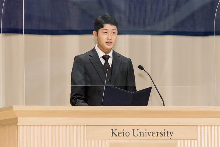 After a congratulatory address by Professor Tomohiko Taniguchi of the Graduate School of System Design and Management on behalf of faculty and staff, Rin Miyamoto a student at the Faculty of Economics offered remarks as a representative for new students. The ceremony concluded with a playback of the Alma Mater "The Juku-ka," to replace the traditional singing of the school song.