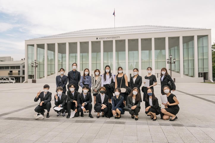 Following the ceremony, there were jubilant scenes of new students taking commemorative photos in front of Hiyoshi Commemorative Hall.