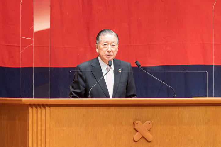 The ceremony began with a live rendition ofHere Stands Yukichi Fukuzawaby students from Keio Yochisha Elementary School and a recorded performance ofNihon no Hokori (Japanese pride)by the Wagner Society. This was followed by a new year's greeting from Keio President Kohei Itoh and speeches from Takeshi Fukuzawa of the Fukuzawa family and Iwasa Hiromichi, Chair of the Board of Councillors.