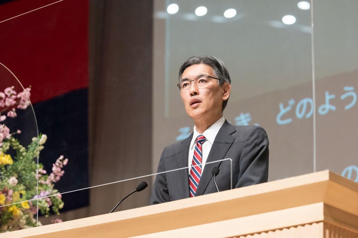 The ceremony began with Vice-President Yoshimitsu Matsuura's Graduating Class Report, followed by President Kohei Itoh conferring degrees on representatives for the graduates of respective graduate schools. In the subsequent Commencement Address by President Itoh, he commended the graduates for following through with their research and obtaining their degrees despite the difficult circumstances of the COVID-19 pandemic. He went on to offer his encouragement to those alumni hoping to become researchers and explore unknown topics that are vital to furthering academic knowledge, as well as those on the path to becoming practitioners, exhorting them to create an enriched and peaceful world imbued with meaning, through challenges, learning, ingenuity, and teamwork, thus showing the path forward as leaders thoroughly exploring their ideals.