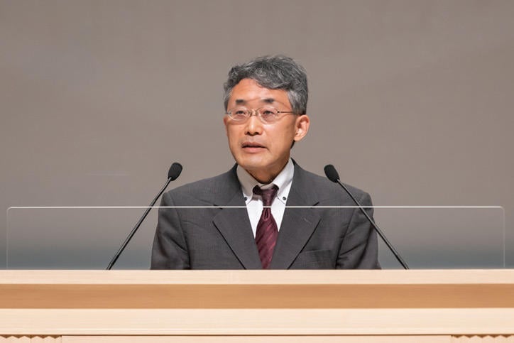 Following this, Professor Hiroshi Matsuo of the Law School delivered a congratulatory address on behalf of the faculty and staff, with the event concluding with a rendition of the "The Juku-ka" alma mater by the mixed chorus group Gakuyu-kai.
