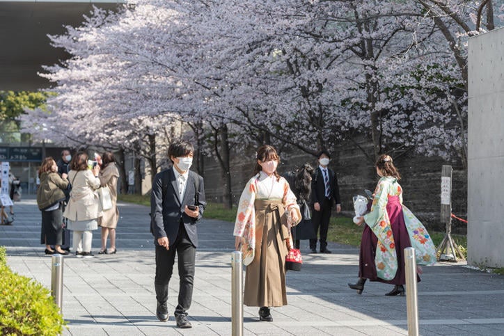 Fine weather was enjoyed on the day of the ceremony, with the jubilant faces of graduates seen celebrating the happy occasion under cherry blossoms in full bloom.
