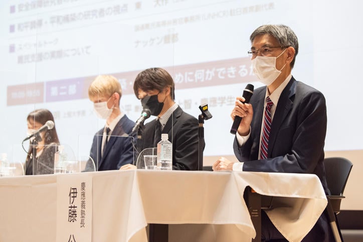 At the beginning of the event, Professor Yoshiaki Terumichi, president of Sophia University, delivered an opening address. Vice-President Motohiro Tsuchiya from Keio University then moderated the first segment of the symposium which followed the theme, "How should we view the Ukraine crisis?" Professor Atsuko Kanehara of Sophia University's Faculty of Law, Professor Yoko Hirose and Associate Professor Michito Tsuruoka of Keio University's Faculty of Policy Management, and Professor Daisaku Higashi of the Sophia Institute of International Relations each gave their respective commentaries on the situation. After this, Ritsu Nacken, the deputy representative at Japan's United Nations High Commissioner for Refugees (UNHCR), discussed the realities of helping refugees.