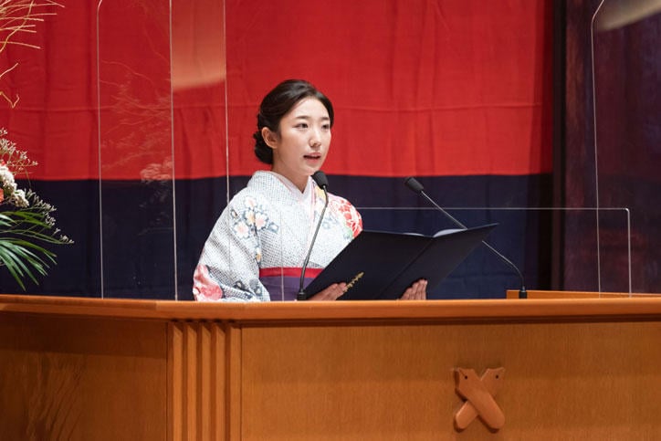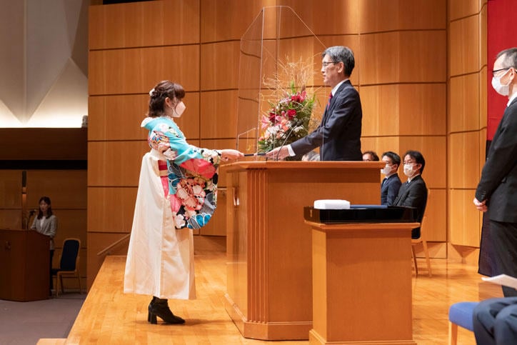 Following the graduating class report, President Itoh presented the student representative with their diploma. After this, Professor Kosuke Oyama of the Faculty of Law delivered a congratulatory address on behalf of the faculty and staff. Then, after the student representative gave a final speech, the choirs who had performed at the Graduate Commencement Ceremony, concluded the ceremony with another performance of the "Juku-ka."
