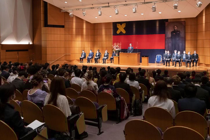 The ceremony began with Vice-President Yoshimitsu Matsuura giving the graduating class report, followed by President Kohei Itoh conferring diplomas to representatives from each graduate school. In his address, delivered in English, President Itoh touched on recent events and applauded the graduates for completing their classes and earning their degrees despite the many obstacles that had arisen during their studies. He exhorted students who were planning to continue their studies to challenge themselves, pursuing research avenues and ideas that "cannot be left unexplored," cooperating and engaging with experts from around the world so that they might broaden the frontiers of academia. At the end of his speech, he said that he looks forward to seeing the future world that the graduates will go on to shape and encouraged them to exhibit the ethos of Keio University so that 30 years from now the world will be a more generous, peaceful, and meaningful place to live. After this speech, Professor Naohisa Yahagi, a Graduate School Committee Member of the Graduate School of Media and Governance delivered a congratulatory address on behalf of Keio's faculty and staff members. The event closed with a performance of Keio's Anthem, the "Juku-ka," by the Wagner Society Male Choir and the Wagner Society Female Chorus.