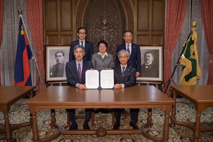 The signing ceremony took place on Keio University's Mita Campus on November 10. President Kohei Itoh and Vice-President Yuko Kitagawa represented Keio University for the ceremony while Chairperson Hirosuke Kobayashi, Kitasato University President Kyoko Shimabukuro, and Special Assistant to the Chair Satoshi Kawase attended on behalf of the Kitasato Institute.