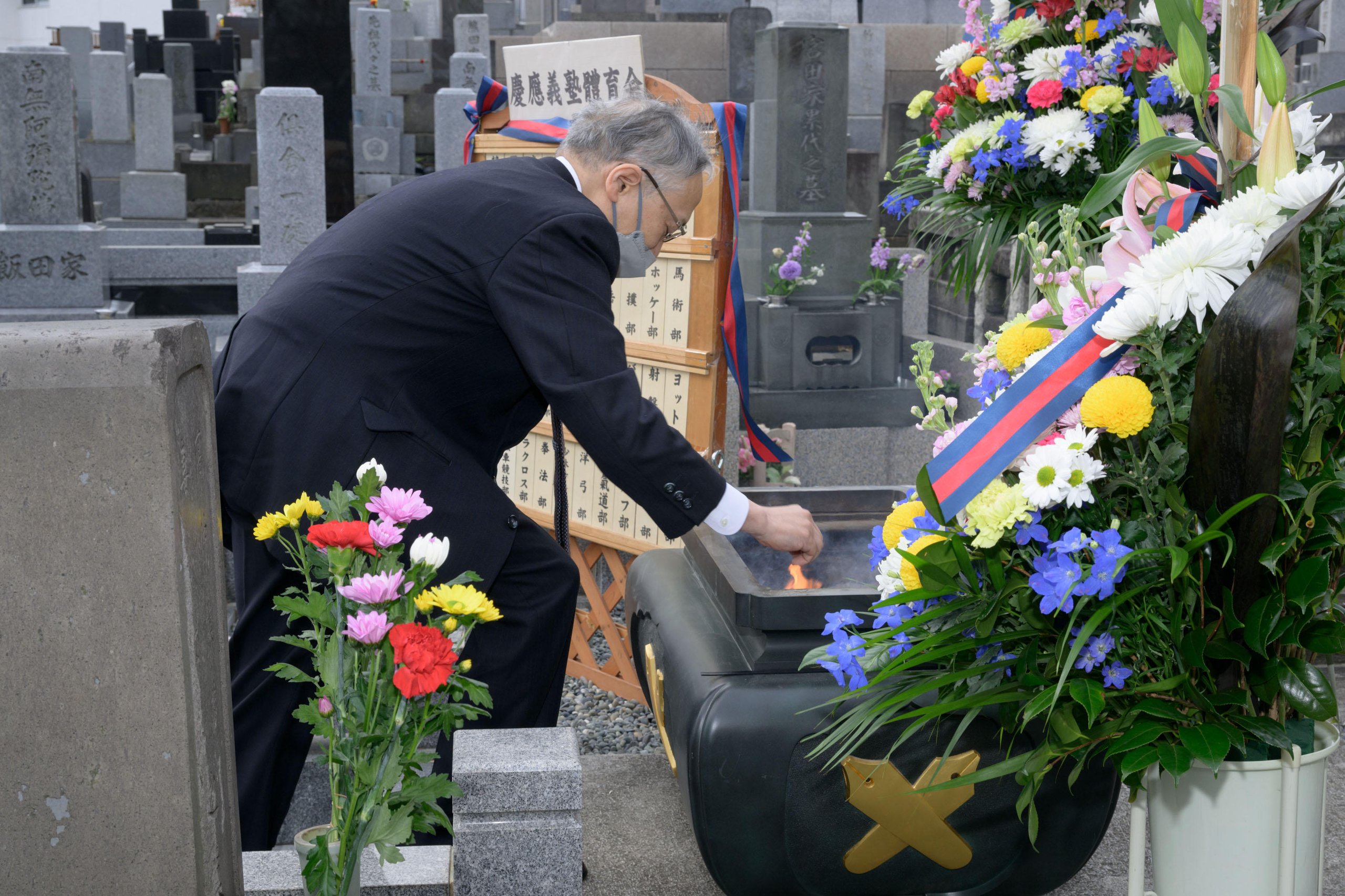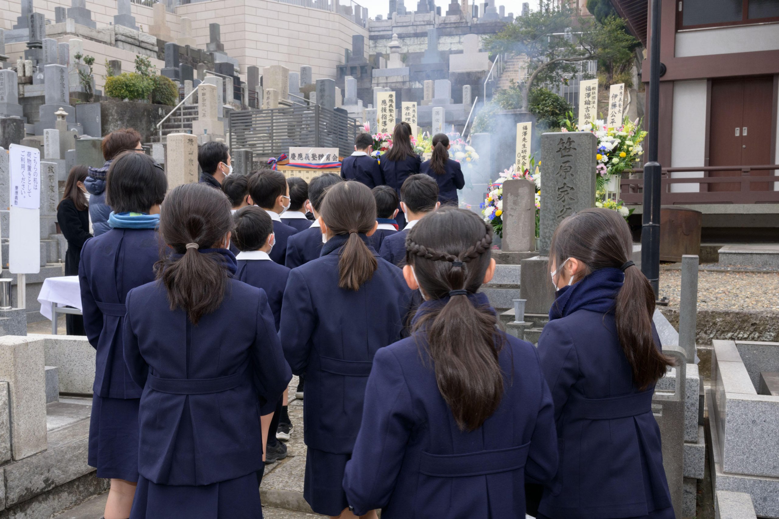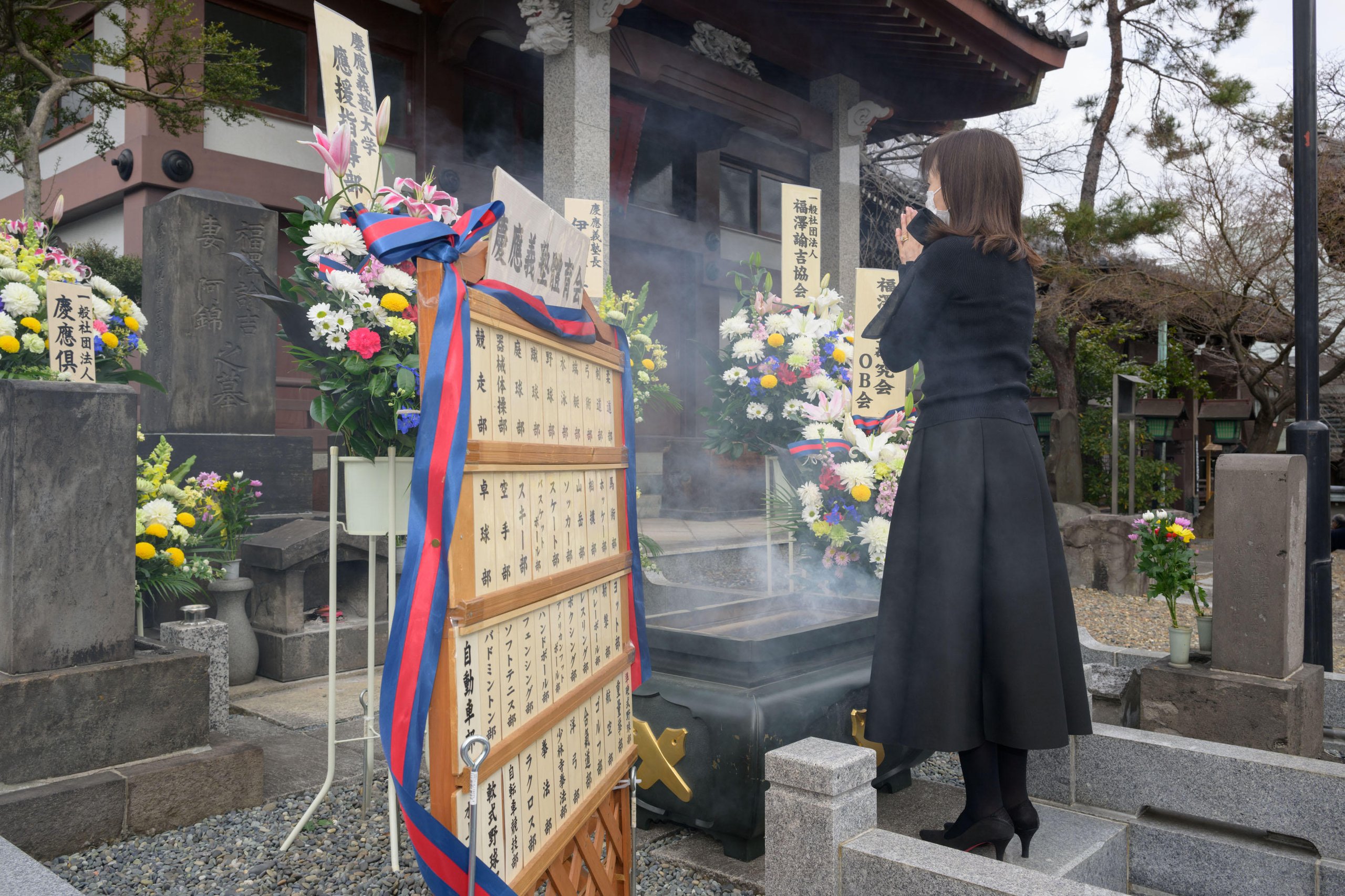 A Buddhist memorial service to mark the 123rd anniversary of Yukichi Fukuzawa's passing was held on Friday, February 3 at Azabu-san Zenpuku-ji, a temple in Moto-Azabu, Minato City. Although the long line of people that would usually form on the memorial day again did not materialize this year because of the COVID-19 pandemic, President Itoh and the visitors who came to pay their respects quietly prayed in front of Fukuzawa's grave in accordance with measures to prevent infections.