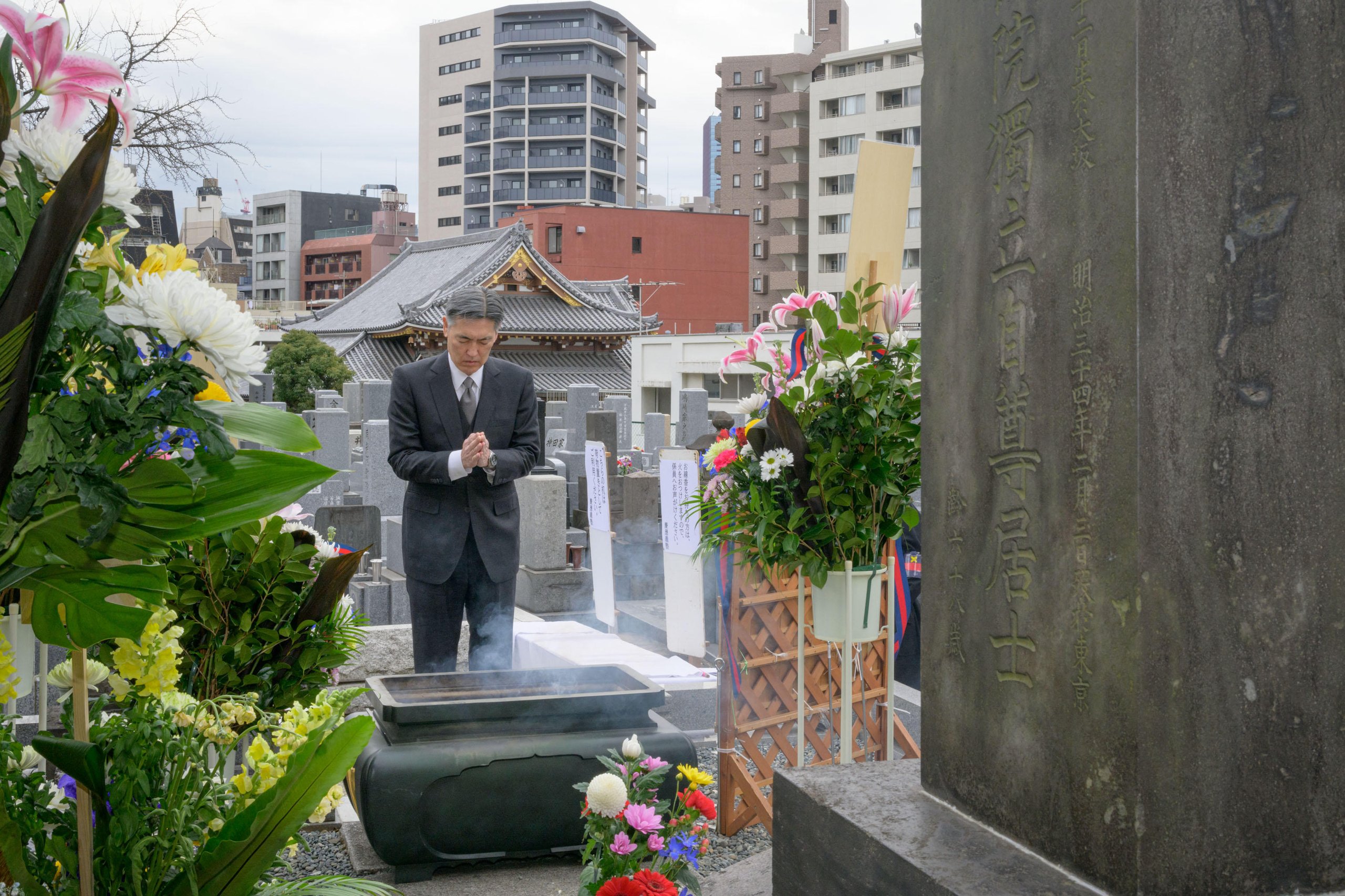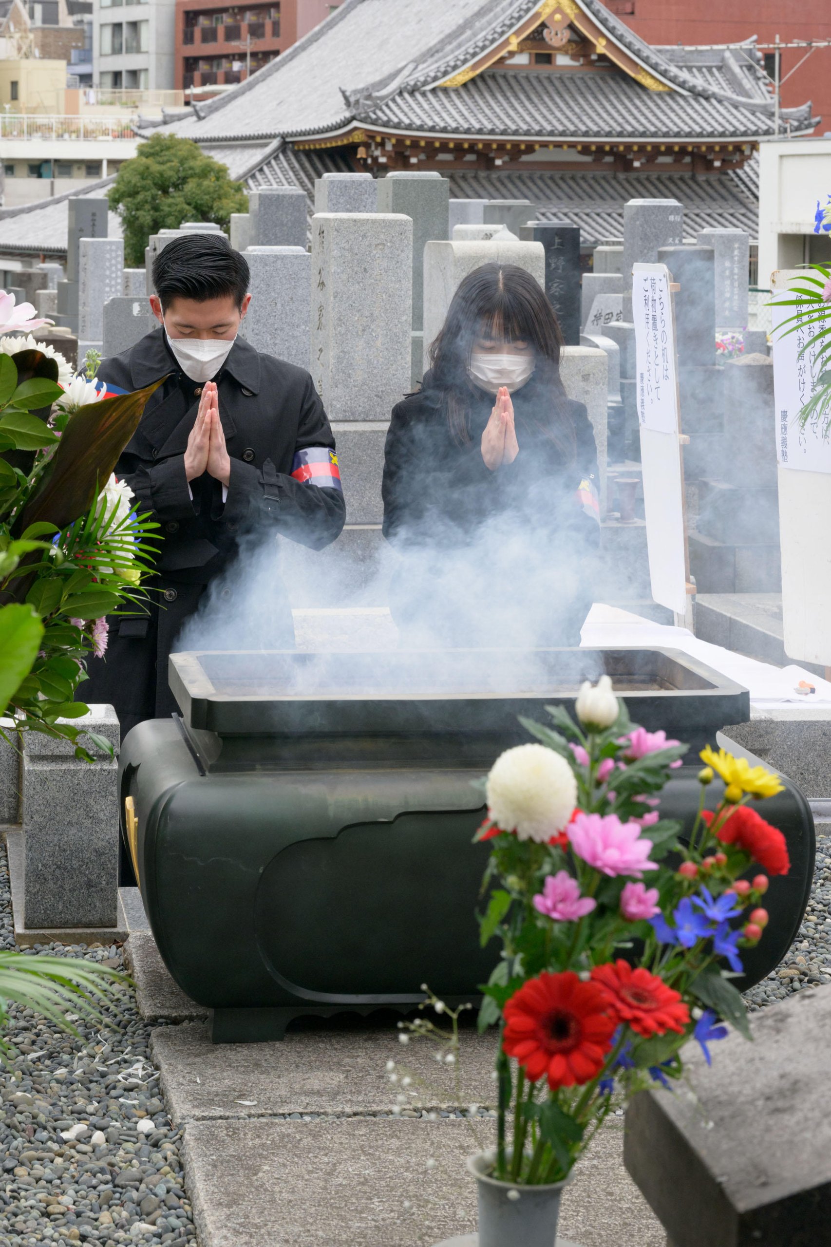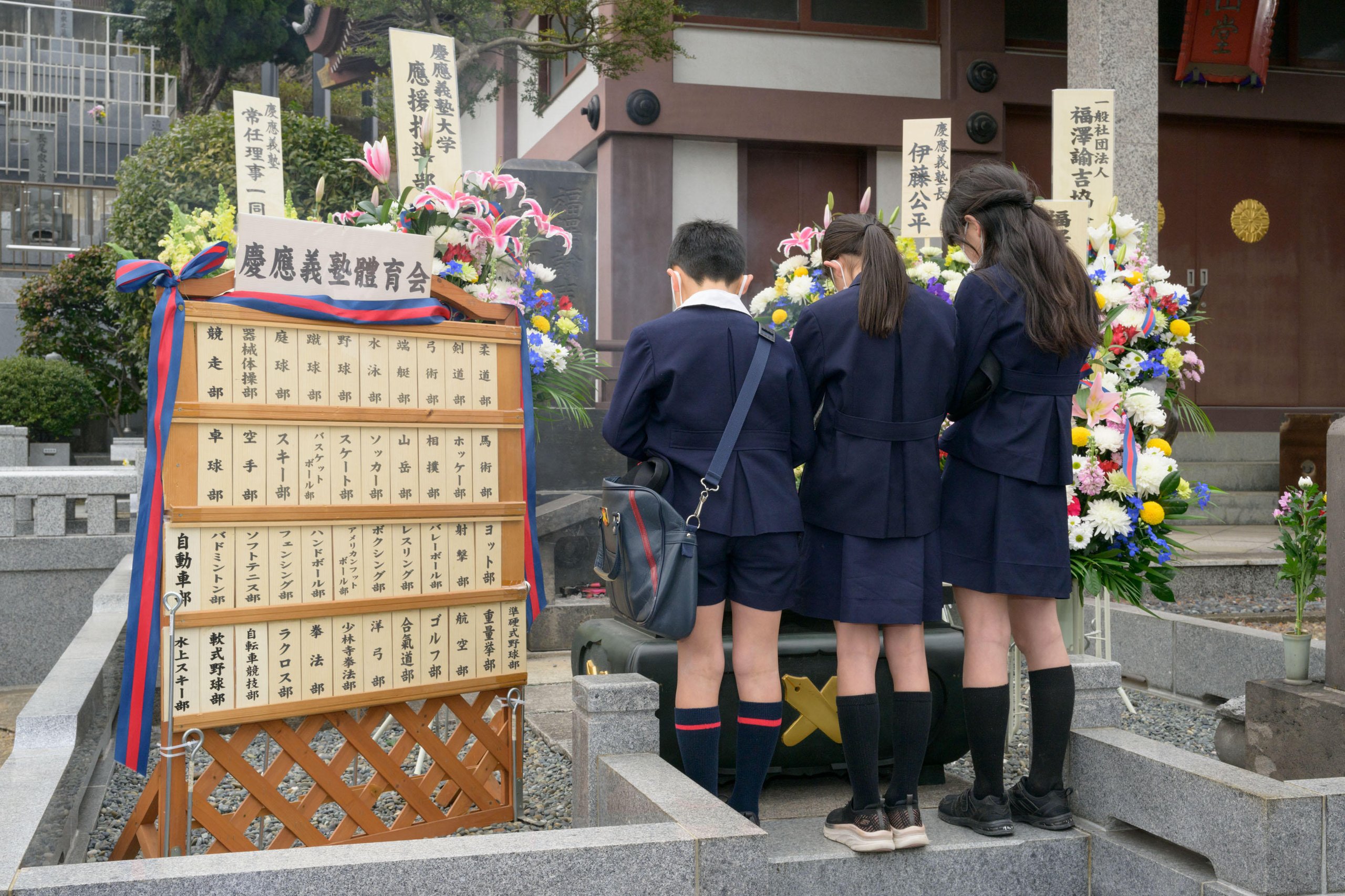 A Buddhist memorial service to mark the 123rd anniversary of Yukichi Fukuzawa's passing was held on Friday, February 3 at Azabu-san Zenpuku-ji, a temple in Moto-Azabu, Minato City. Although the long line of people that would usually form on the memorial day again did not materialize this year because of the COVID-19 pandemic, President Itoh and the visitors who came to pay their respects quietly prayed in front of Fukuzawa's grave in accordance with measures to prevent infections.