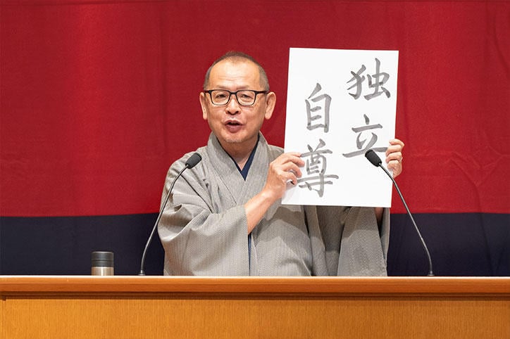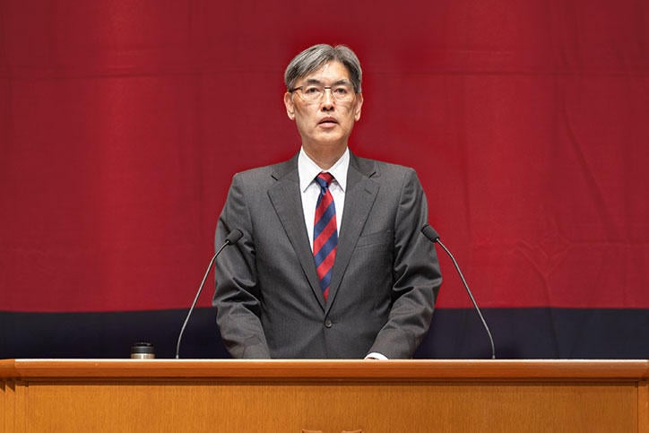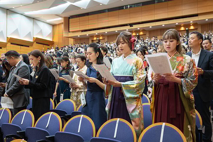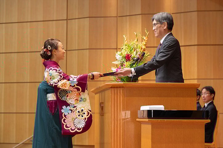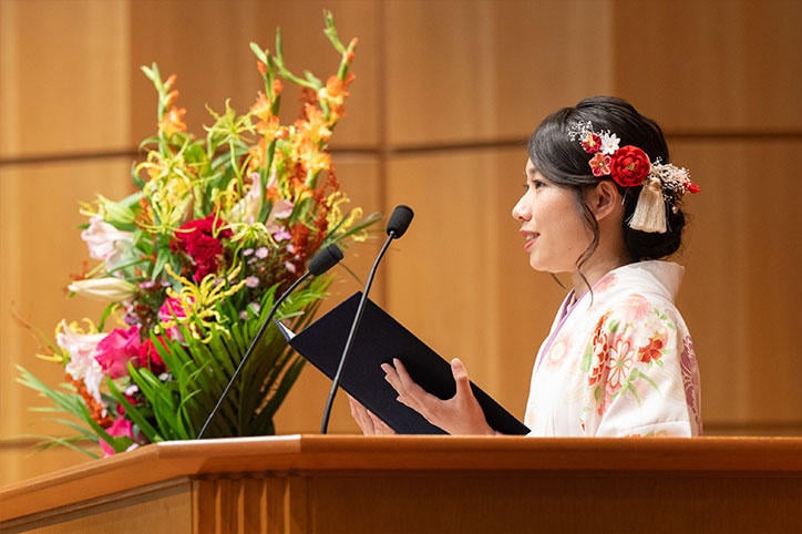 Following the graduating class report, President Itoh presented the student representative with their diploma. After this, Professor Koichiro Tanaka of the Faculty of Policy Management delivered a congratulatory address on behalf of the faculty and staff. Then, after the student representative gave a final speech, the choirs who had performed at the Graduate Commencement Ceremony concluded the ceremony with another performance of the Juku-ka.