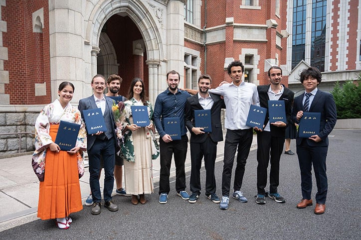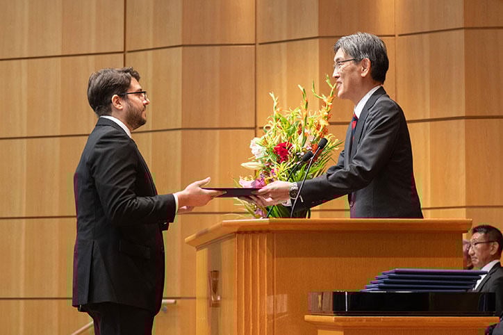 The ceremony began with Vice-President Yoshimitsu Matsuura's graduating class report, followed by President Kohei Itoh conferring degrees on representatives for the graduates of their respective graduate schools. In his commencement address, which was delivered in English, President Itoh expressed his wish for Keio graduates to become people who will shape the common sense of the future. In order to achieve this, he hoped that they would be able to utilize not only Japanese, but also lingua francas such as English, to tell stories that can inspire and touch the hearts of others through public speaking. He then encouraged the graduates to make use of the Mita-kai alumni network to contribute to the progress of our communities and society at large on the world stage so as to create a better, brighter, and more peaceful place. After this speech, Professor Takashi Maeno, a Graduate School Committee Member of the Graduate School of System Design and Management, delivered a congratulatory address on behalf of Keio's faculty and staff members. The event closed with a performance of Keio's anthem, the "Juku-ka," by the Wagner Society's men's and women's choirs.