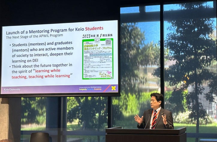 On September 25, Vice-President Tsuchiya delivered a presentation titled "Equity, Diversity and Inclusion (DEI) Initiatives at Keio University" in which he introduced various initiatives and programs such as theKeio Mentoring Program, theInternational Women's Day workshop co-hosted with the University of Melbourne, as well as theDEI Symposiumwhere female faculty members who had participated in the APRU Asia-Pacific Women in Leadership (APWiL) Mentoring Program shared their experiences, DEI strategies, resources, and goals via presentations, a moderated panel discussion, and a Q&A session with participants.