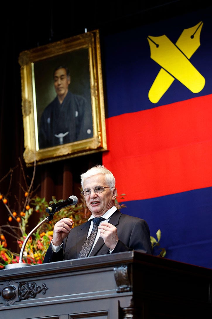 At the award ceremony, Professor Haruhiko Siomi of the School of Medicine, as the chairperson of the Keio Medical Science Prize selection committee, reported on the selection process and introduced the award recipients' biographies and contributions to the field of medical science. In the selection process report, it was detailed that the committee members from both within and outside of Keio University strictly screened 134 candidates and selected two recipients among them, one from overseas and one from Japan. Following the report, President Kohei Itoh presented Professor Ferrara and Professor Mori with medals and certificates before delivering a congratulatory address. After that, Masahito Moriyama, Minister of Education, Culture, Sports, Science and Technology, Evan Felsing, Minister Counselor for Economic and Scientific Affairs at the U.S. Embassy in Tokyo, and Enrico Traversa, Science & Technology Counselor of the Embassy of Italy in Tokyo, delivered their congratulatory speeches to the recipients. The ceremony then concluded with speeches from both recipients where they expressed their joy at receiving the award, detailed the trajectories of their research, and spoke of their gratitude towards their families.