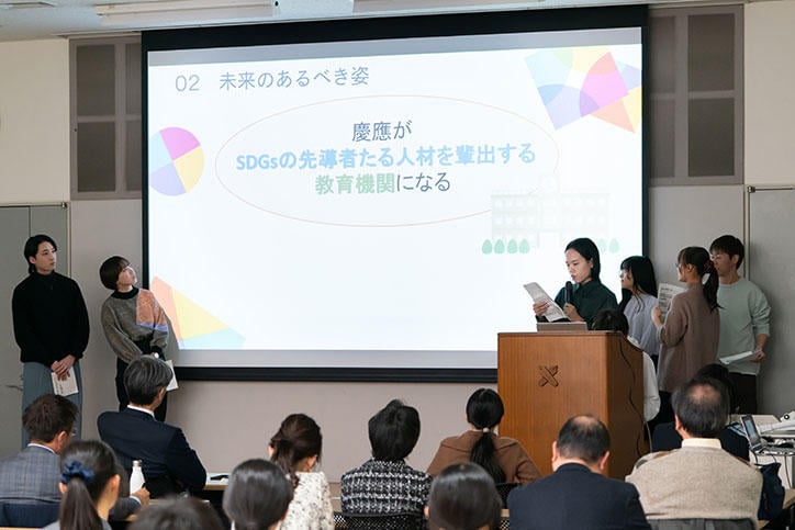 The Student Conference, which completed its second iteration in December, is a component of Keio University's "Sustainable Development Goals (SDGs)" initiatives. Students are selected from across all of Keio's undergraduate faculties to discuss and propose an overall vision, specific objectives, and attainable targets for Keio University to accomplish to make progress towards its SDGs. In the spring semester, students attended lectures from various experts in their fields in order to deepen their understanding of current events in Japan and the rest of the world as they pertain to the SDGs. In the fall semester, students then divided into subcommittees for further discussions about how they envision the university should ultimately work towards these issues, and then summarized their ideas and findings into recommendations. This event was the culmination of all their work. In addition to university students, this year's presentation also included proposals from students who belong to Keio's affiliated schools.