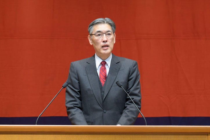 This year's ceremony began with choral performances ofHere Stands Yukichi Fukuzawa, sung by students from the Keio Yochisha Elementary School and the Keio Yokohama Elementary School, andNihon no Hokori(Pride of Japan), sung by the Wagner Society Male Chorus. In his new year's greeting, President Kohei Itoh expressed his condolences to the victims of the Noto Peninsula Earthquake and related incidents in Ishikawa Prefecture, and appealed for cooperation in providing support to the many people affected by the disaster, including Keio students and applicants. He also spoke with vigor about how Keio University, in 2024, will continue to be united as one in pursuing discussions based on high aspirations in all fields including education, research, medical care, and internationalization, for the development of Japan and the world.