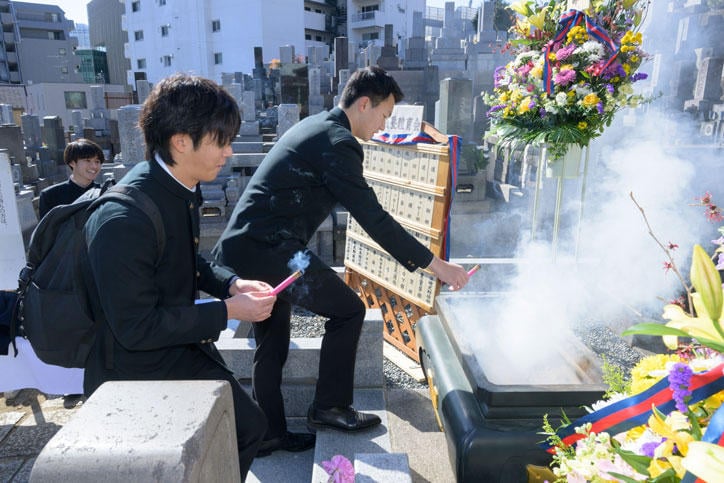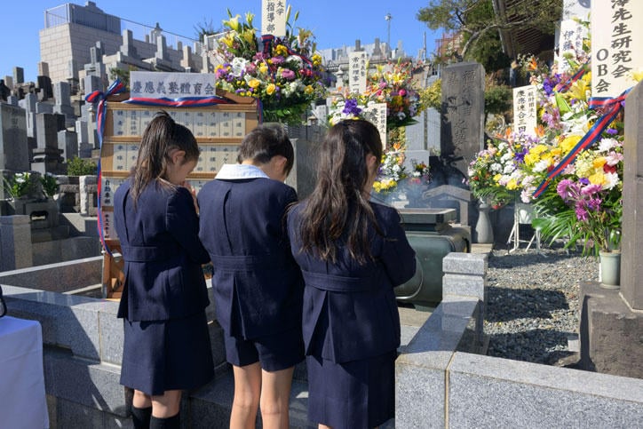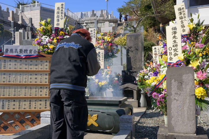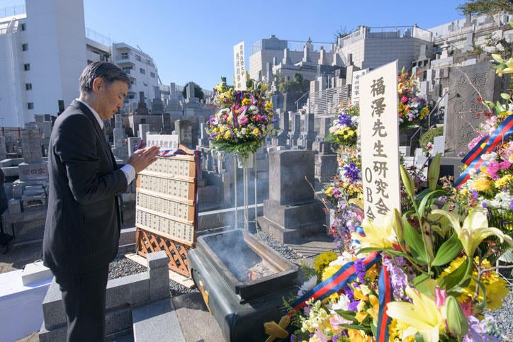A Buddhist memorial service to mark the 124th anniversary of Yukichi Fukuzawa's passing was held on Saturday, February 3 at Azabu-san Zenpuku-ji, a temple in Moto-Azabu, Minato City. Under a clear blue sky, many Keio students, alumni, faculty and staff members, as well as Keio affiliated school students accompanied by their families visited his grave to pay their respects.