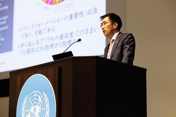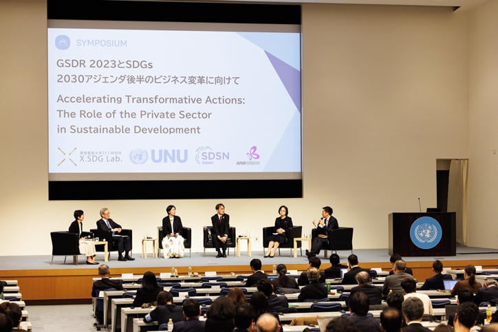 On March 1, 2024, the United Nations University and xSDG Laboratory of the Keio Research Institute at SFC co-hosted a symposium titled Accelerating Transformative Actions: The Role of the Private Sector in Sustainable Development. The symposium, held at the United Nations University’s U Thant International Conference Hall, offered simultaneous interpretation in English and Japanese and delved into topics surrounding the 2023 Global Sustainable Development Report, leading to lively discussions on the role of corporations in achieving the SDGs.