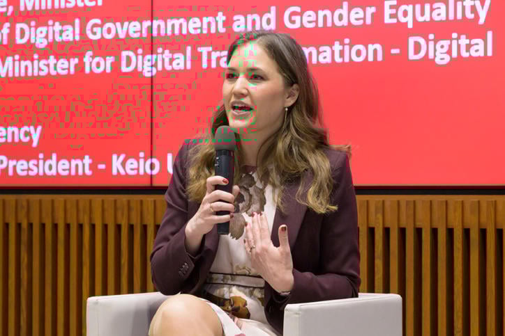 During the symposium, Minister Bjerre, Minister Kono, and President Itoh held a panel discussion on the theme, "Innovation through the Ethical Use of Data and AI." Minister Bjerre emphasized the importance of digital literacy as we try to find ethical and responsible ways of utilizing data through AI-driven services. She then went on to discuss digitalization measures Denmark is taking to confront the declining labor force as well as their efficient green transition initiatives which are aimed at solving the country's energy crisis. Minister Kono raised the issue in generative AI of needing to increase data sets in languages other than English as the technology relies overwhelmingly on English at present. President Itoh then pointed out how it is essential that companies and universities work closely with one another to train up experts who are able to use this technology to its fullest potential without being swayed by generative AI.