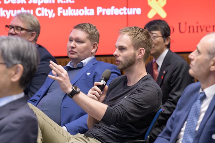During the latter half of the symposium, CEOs from various Danish corporations took to the stage to introduce services they provide which rely on cutting-edge technologies and practical examples of how they have been implemented. Mayor Takeuchi from Kitakyushu then went into detail about the "SUMARAKU Ward Office Service Project" (Sumaraku Kuyakusho), an online support window for Kitakyushu's city hall powered by technology that came about through a collaboration with Danish corporation.