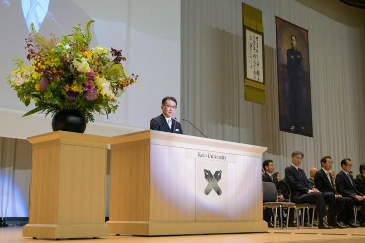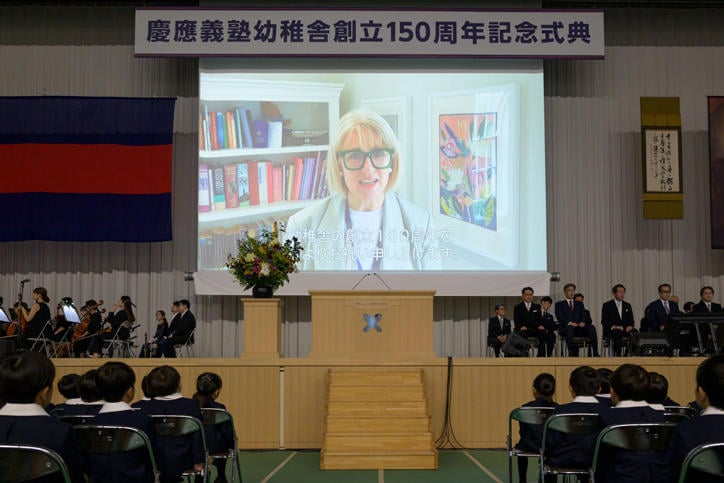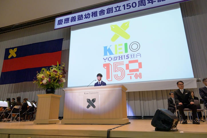 The ceremony began with an opening video, followed by a singing of "Yochisha no Uta" (The Yochisha School Song), a ceremonial address by Headmaster Shigenari Sugiura, a congratulatory address from President Kohei Ito, a presentation of the commemorative logo design by Creative Director Kashiwa Sato, and a congratulatory address (via video) from Headmistress Emma Goldsmith of the Dragon School in the UK. Finally, Rino Funabiki delivered a congratulatory speech as the representative of the Yochisha students. The opening video was directed by Katsuo Fukuzawa (Yochisha Class of 1976), with music by Akira Senju (Yochisha Class of 1973) and narration by Takahiro Inoue (Yochisha Class of 1997). It was a story-driven video that chronicled how Keio University's elementary education began. The powerful video was shown as the hall went dark, leading into the Yochisha students' singing of "Yochisha no Uta," creating a memorable opening.