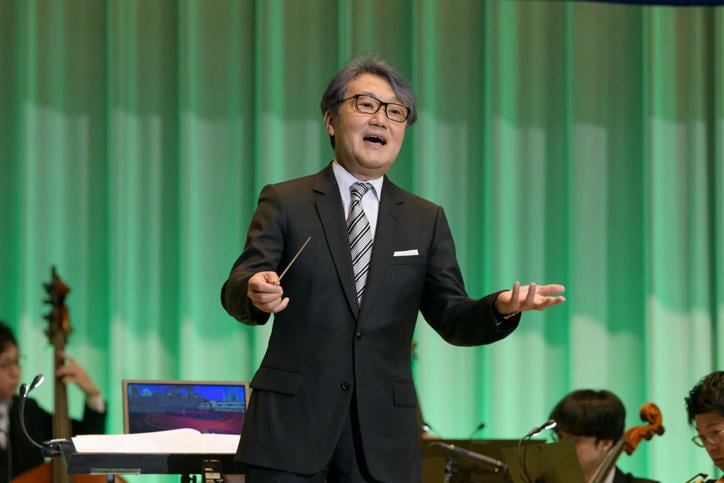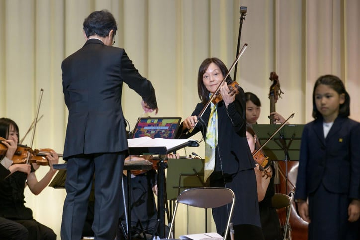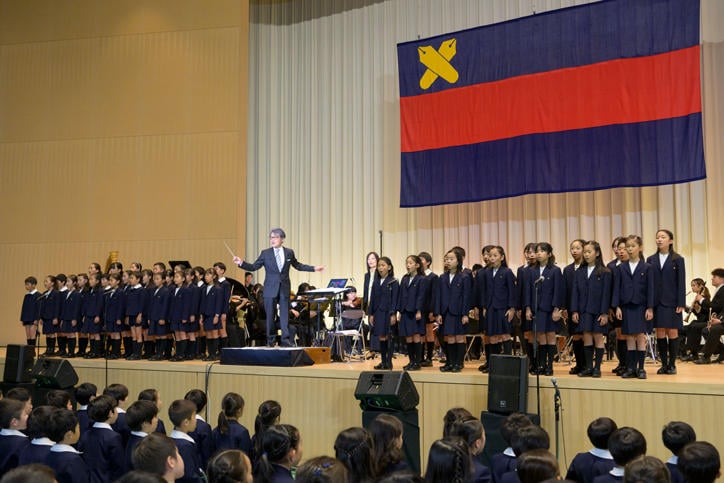 In the second half of the ceremony, three 150th anniversary commemorative songs were performed. "Aozora Pocket" (lyrics: Akiko Takagi, music: Kan Wakamatsu) was conducted by Kan Wakamatsu (Yochisha Class of 1978). For "Yochisha Kazoku" (lyrics: Yochisha students of 2021 & Eri Ishikawa, music: Akira Senju) and "Pen no Sasu Hou e" (lyrics: Sho Sakurai, music: Akira Senju), the 150th Anniversary Ceremony Choir and all Yochisha students gave a spirited vocal performance under the direction of Akira Senju. For "Pen no Sasu Hou e," Mariko Senju (Yochisha Class of 1975) played the violin along with the SENJU LAB Grand Philharmonic orchestra, adding a beautiful touch to the Yochisha students' chorus. Blessed with fine weather, the commemorative ceremony concluded with great success.