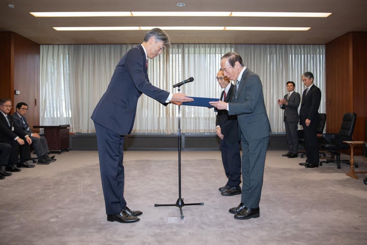 On July 3, a ceremony was held at the head office of the Bank of Japan where Kazuo Ueda, governor of the Bank of Japan, presented the final 10,000 yen note printed with the old design to Keio University President Kohei Itoh. Keio University had previously received the two other designs with the portrait of its founder, Yukichi Fukuzawa, printed on it―one from the 1984 series and the other from the 2004 series―from the Bank of Japan. Governor Ueda expressed his appreciation for Keio University's longstanding cooperation in publicizing the banknotes, such as through the commemorative exhibition of the second series of the 10,000 yen note featuring the portrait of Yukichi Fukuzawa. Governor Ueda then personally presented to President Itoh a 10,000 yen note with the serial number "ZE300000X" from the final production lot of the 2004 series.