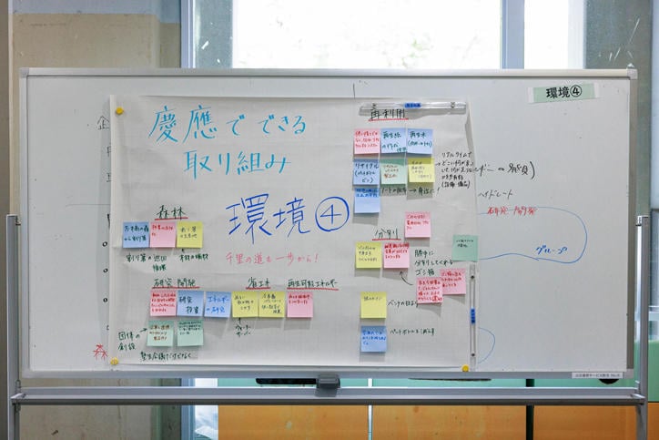 In the first round of discussions, under the theme "The Ideal Keio University in 2050," participants were divided into four groups—"Environment," "Society," "Economy," and "Partnership"—to exchange ideas. After lunch, a second round of discussions was held in the afternoon to consider "actions to achieve" the "ideal vision" that was identified in the morning.