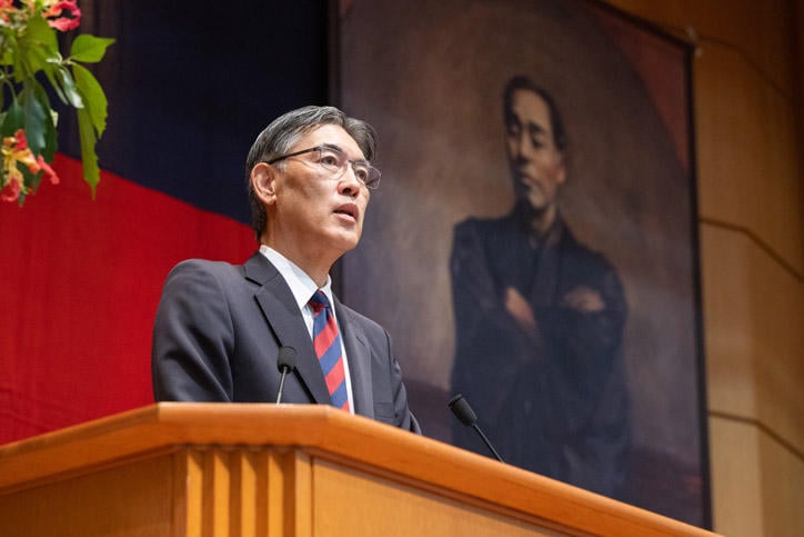 The ceremony began with Vice-President Yoshimitsu Matsuura delivering the incoming class report. This was followed by the conferral of diplomas by President Kohei Itoh to the representative undergraduate, master's, and doctoral students, as well as the presentation of the Commendation for Academic Excellence to outstanding undergraduate students in accordance with the Keio University Rules and Regulations for Commendation.