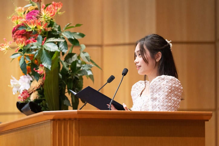 In his address that followed, President Itoh conveyed his belief that in today's increasingly divided society, Keio alumni can play an intermediary role and serve as bridges in a polarized world, contributing to environmental conservation and the healthy development of society. After that, Professor Hideki Sunahara from the Graduate School of Media Design (KMD) gave a congratulatory address and Lianne Bianca Cagalingan, the student representative from the Faculty of Environment and Information Studies, responded with a speech on behalf of the graduates. The ceremony then concluded with a rendition of the Alma Mater,The Juku-ka.