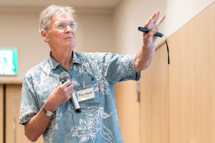 On Friday, September 27, Dr. Tim Hunt, winner of the Nobel Prize in Physiology or Medicine in 2001 for the discovery of key regulators of the cell cycle, gave a lecture in the Medium Conference Room on the 11th floor of Building 2 on Shinanomachi Campus.