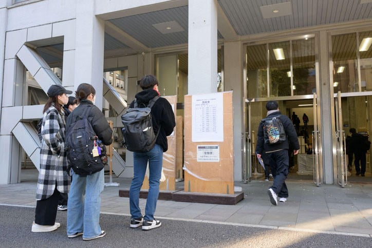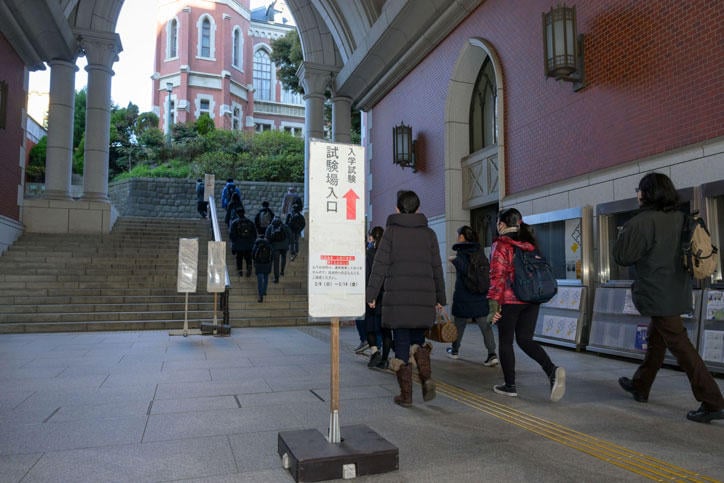 The photos show the scene on the day of the entrance examination for the School of Medicine at Mita Campus on February 9.