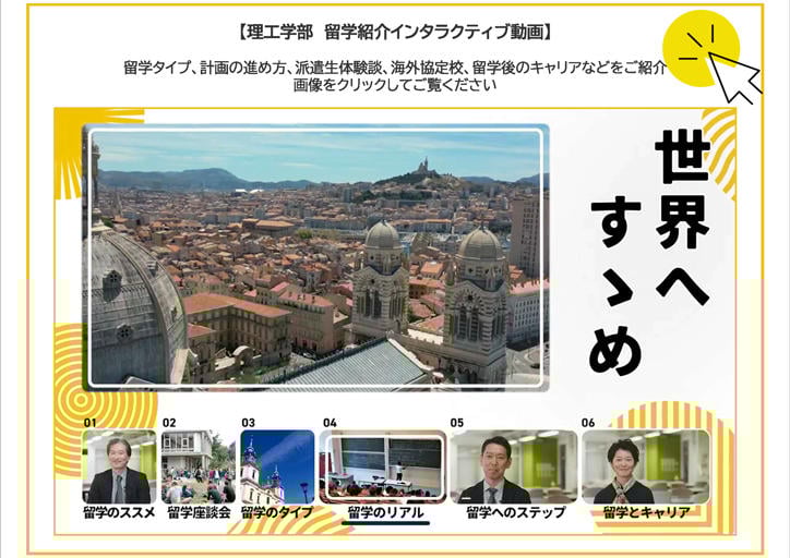 The Faculty of Science and Technology has released "Sekai e Susume," an interactive video introducing study abroad programs , to showcase their appeal to a wider student audience. This video provides an easy-to-understand introduction to experiences at study abroad destinations and the features of the programs.