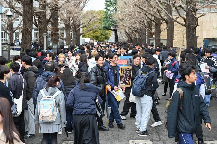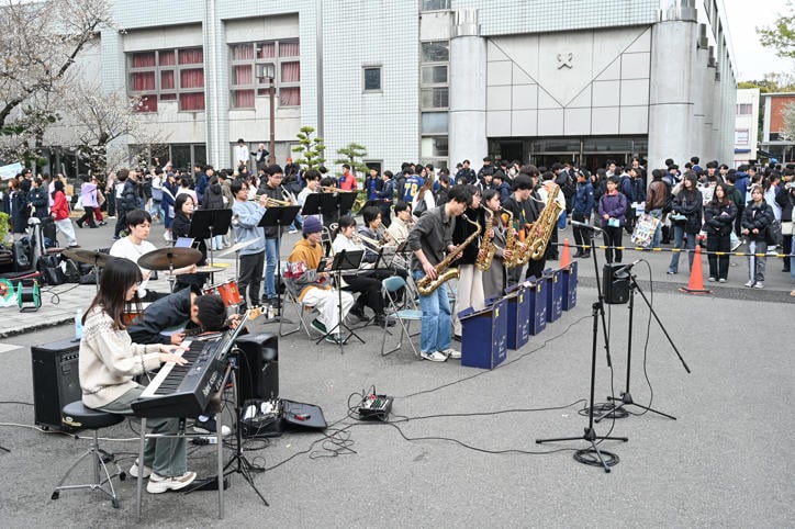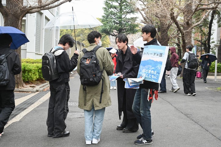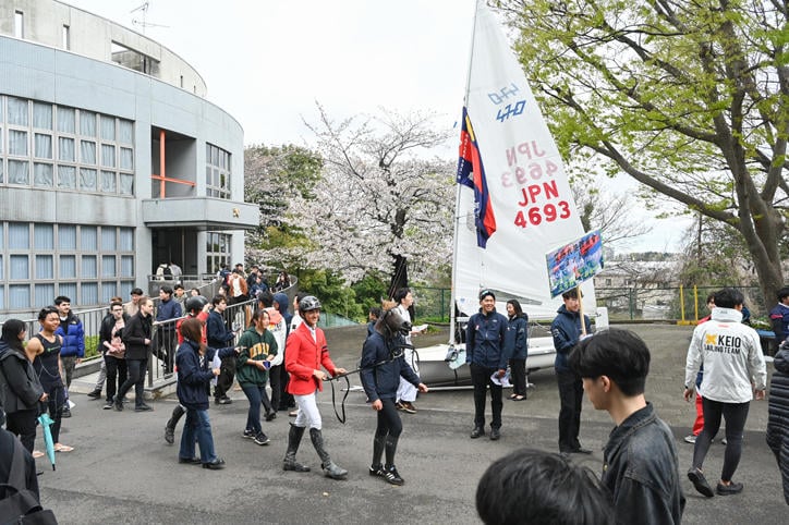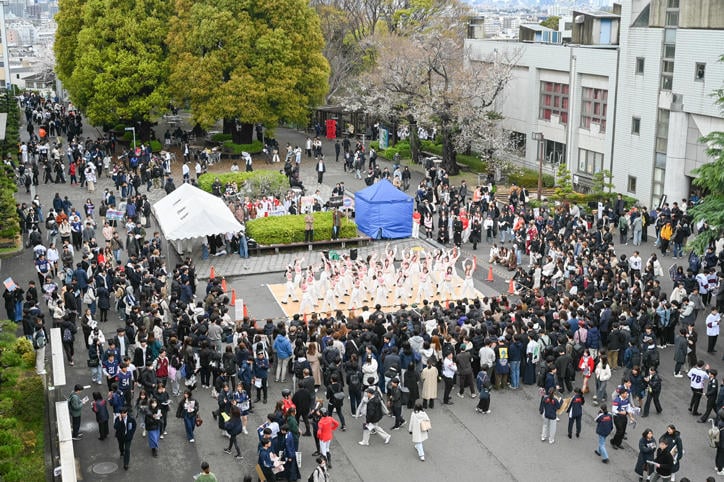 Hiyoshi Campus bustled with excitement during orientation, with student organizations recruiting new students and giving stage performances. Unperturbed by the persistent inclement weather, the throngs of new students filled the campus with their youthful energy under the cherry blossoms in full bloom. (Photos taken on April 2, 2025)