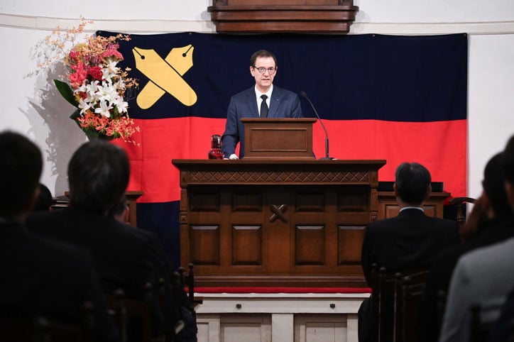 At the ceremony, Professor Shinnosuke Obi of the Faculty of Science and Technology served as master of ceremonies, Dean Toshiyuki Murakami read the citation, and President Kohei Itoh conferred the honorary degree. Following this, President Itoh paid tribute to Dr. Bennis’s achievements, and Professor Xavier Bressaud, counselor for science and technology at the French Embassy in Japan, delivered a congratulatory address.