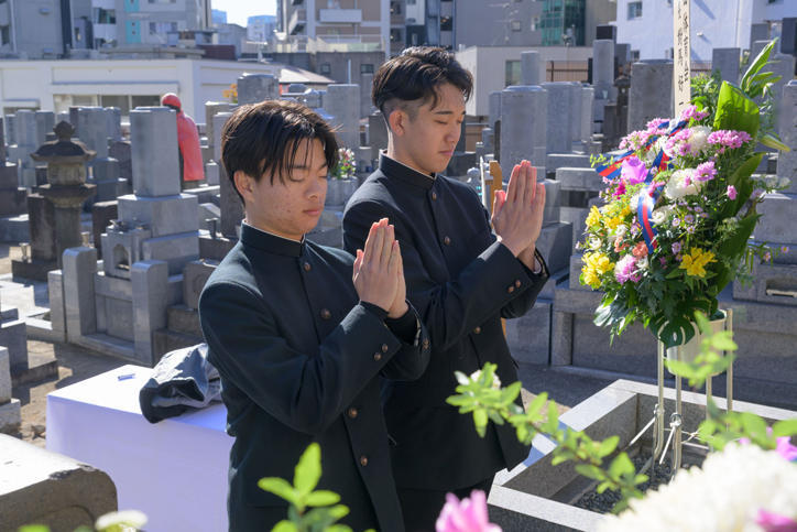 On Tuesday, February 3, students from the university and its affiliated schools, alumni, faculty, staff, and other members of the extended Keio community gathered at the grave of Yukichi Fukuzawa at Azabu-san Zenpuku-ji temple in the Moto-Azabu neighborhood of Minato Ward for a Buddhist memorial service to pay their respects on the 126th anniversary of the Keio founder’s passing.