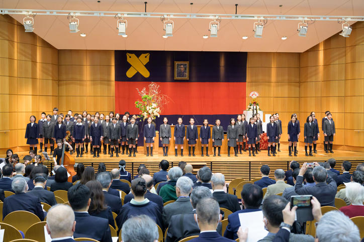 The ceremony began with choral performances of "Here Stands Yukichi Fukuzawa" by students from the Keio Yochisha Elementary School and the Keio Yokohama Elementary School, and "Nihon no Hokori" (Pride of Japan) by the Wagner Society Male Chorus. Next, President Kohei Itoh rose to deliver his New Year's address.