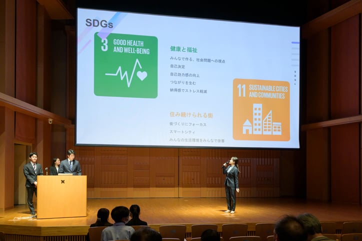 This year continued the previous year’s theme of “Keio University Towards 2050 .” Students deepened their understanding of the state of affairs in Japan and the world as they pertain to the SDGs by participating in lectures by experts in the Spring Semester and a summer camp with other students from Keio’s affiliated schools. In the Fall Semester, the students worked in groups to discuss and finalize their proposals on specific actions required for Keio to realize its aims. This event was the culmination of all their work.