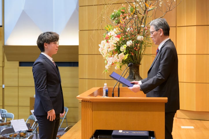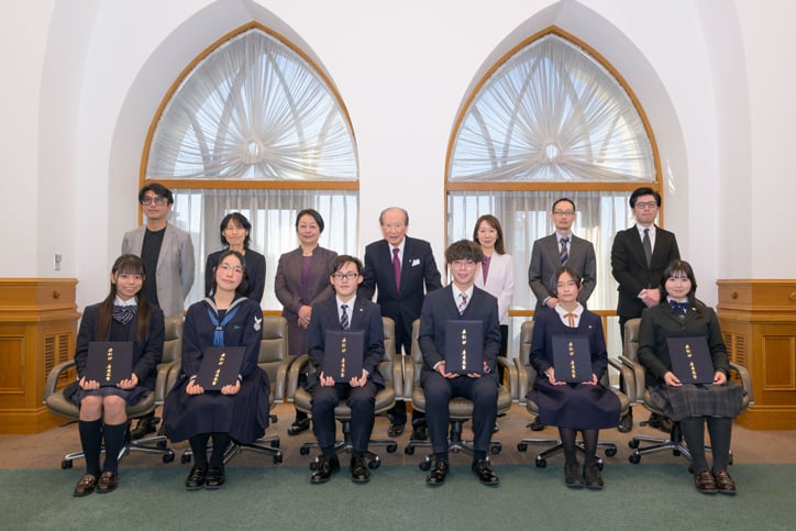 At the 191st Yukichi Fukuzawa Birthday Commemoration held on Saturday, January 10, the awards ceremony for the 50th Shinzo Koizumi National High School Essay Contest took place, and President Kohei Itoh presented certificates to the winners.