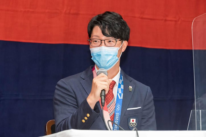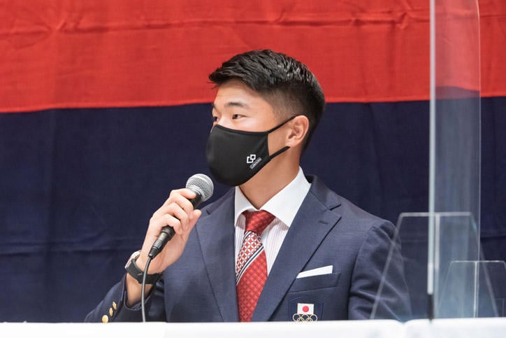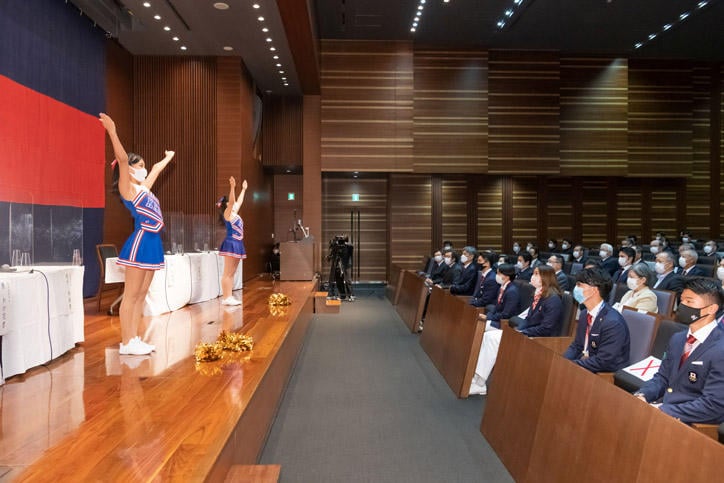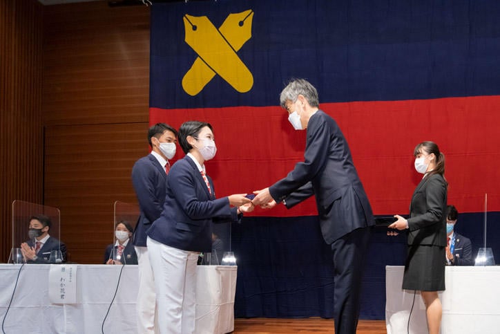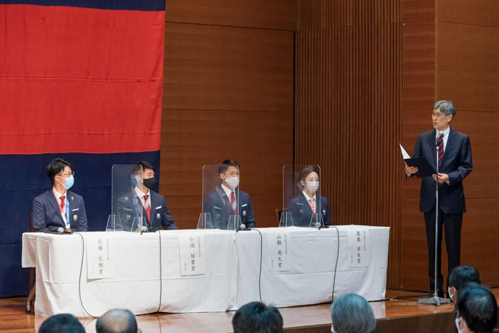 During this Summer's Tokyo 2020 Olympic and Paralympic Games, a total of 10 Keio students and alumni competed as athletes in their specialized events. To celebrate their achievements, the university held a "President's Reception for 2020 Tokyo Olympic and Paralympic Athletes," on Tuesday, September 28, in Mita Campus's South School Building Hall. In order to give the utmost priority to the health and safety of the participants and prevent the spread of COVID-19, invitations were limited to athletes and related individuals with the proceedings broadcast live online.