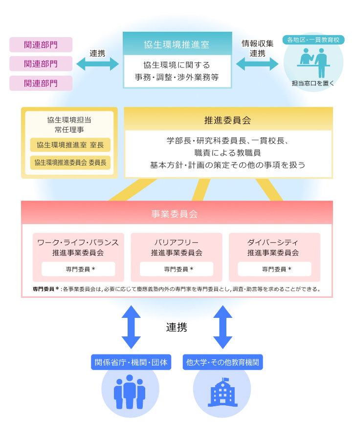 Keio University has established the Office for Equity, Diversity, and Inclusion to build an environment where its faculty and staff, university students, pupils, and children can respect each other's dignity, recognize diverse values, and live cooperatively. The office was created to promptly address issues related to the acceptance of diversity and promotes various initiatives to realize an environment of equity, diversity, and inclusion.