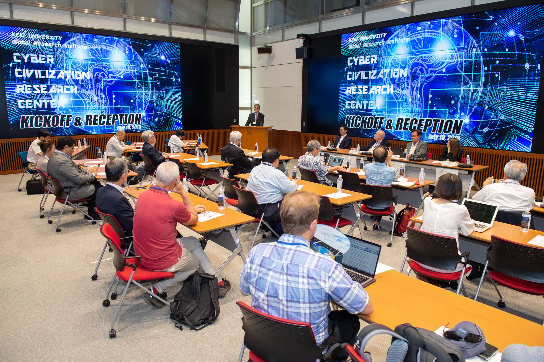 The Cyber Civilization Research Center (CCRC) Kickoff & Reception was successfully hosted at the G-lab in Mita Campus, on July 18, 2018. The event started with President Haseyama's speech welcoming the arrival of Professor David Farber, a distinguished leader in the field, as the Co-Director of CCRC.