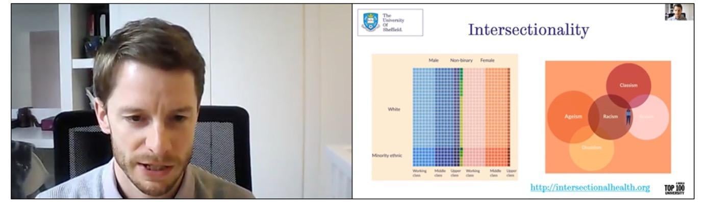 The second panelist was Dr. Daniel Holman from Department of Sociological Studies and the Healthy Lifespan Institute, the University of Sheffield. His presentation "Social determinants, health inequalities and healthy ageing" was composed of three parts: (1) the concept of healthy aging, (2) social determinants and health inequalities, and (3) what individuals and societies can do to promote healthy aging and increase healthy life expectancy. According to WHO, healthy aging is defined to have the functional ability to do what we/society value, and Dr. Holman explained that the functional ability is the result from intrinsic capacity of an individual, the environment that forms the context of an individual's life, and the interaction between the two. It was pointed out that social determinants of health and healthy life expectancy are often shaped by wider cultural, economic factors, which can lead to inequality of healthy aging. Therefore, policies must target the social determinants of health in the context of healthy aging inequality, and by doing so, health inequalities can be narrowed. He also highlighted that inequalities exist not only in place where people live, but also occupation, education, gender, ethnicity etc., which overlap and interact with each other, and we need to be aware of these intersectional factors when considering healthy aging. The presentation was concluded that individual responsibility and social determinants are both important for health behaviors, and decrease of inequality is a long-term policy goal.