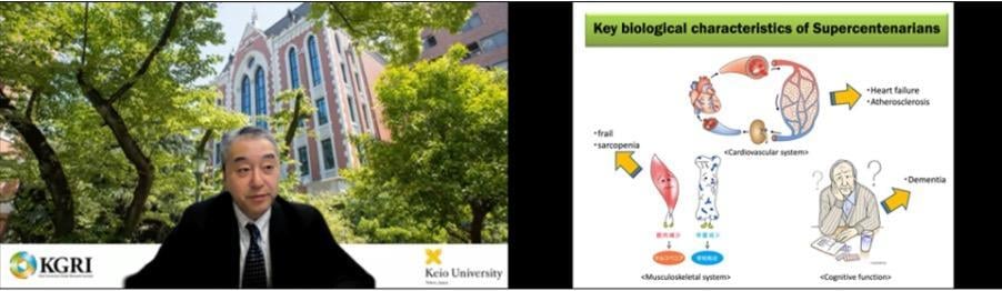 The first panelist was Professor Yasumichi Arai from Faculty of Nursing and Medical Care, Center for Supercentenarian Medical Research, Keio University. Professor Arai has been involved in studies of centenarians in Japan for 20 years, and his presentation entitled "How to promote Healthy Aging; Lessons from Supercentenarians" consisted of four parts: (1) overview of centenarians (100-104 years old), semi-supercentenarians (105-109 years old) and supercentenarians (over 110 years old) in Japan, (2) results of genetic and biological studies regarding supercentenarians, (3) influencing factors for longevity, and (4) results of his recent study on how COVID-19 pandemic influenced elder's lifestyle. He emphasized that in addition to genetic and biological factors, frequency of physical activity significantly affects mortality in people over the age of 85, and it is never too late to start exercising. The study on behavioral change and hygiene practices of Japanese older adults during COVID-19 pandemic revealed that having a daily neighborhood communication may prevent decline in conversation time even during emergencies, suggesting the significance of human interrelationship for our well-being. The presentation was concluded by illustrating four elements of healthy longevity: social function such as active working and financial security, wellbeing such as happiness and life satisfaction, biological aging such as frailty and disease of aging, and functional age such as cognitive, physical and sensory functions.