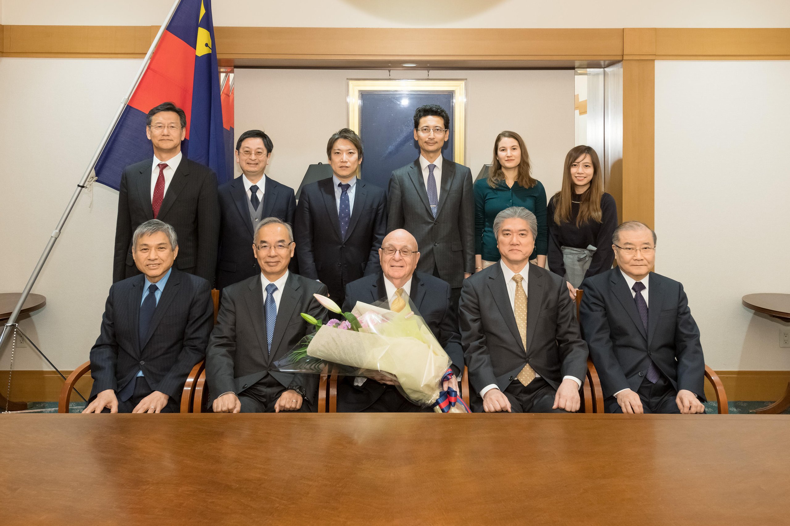 (from front left) Vice-Presidents Naoki Watanabe and Masahito Omori, Professor Farber, President Haseyama, Provost Tojiro Aoyama